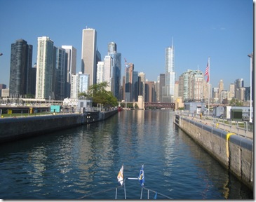 We got an early start from DuSable Harbor and entered the Chicago lock at the entrance to the Chicago River at about 8:00 a.m. We were the only boat entering the lock – always a good thing.